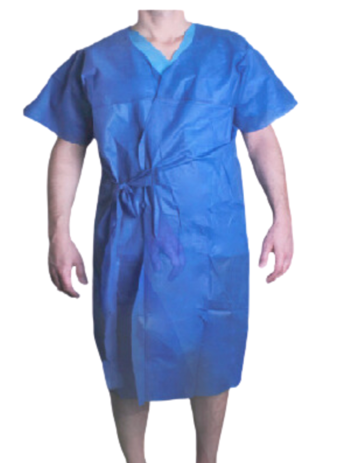 Prenda desechable para paciente, con manga corta y apertura frontal o posterior; fabricado en Tela no Tejida de capas llamada SMS (Spunbond Meltbown Spunbond) de 40g.